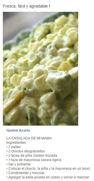 ENSALADA DE PALTA, CHOCLO DESGRANADO PIÑA Y MAYONESA - La compartió graciosamente Gastón en Facebook - (Receta de su Mamá.)